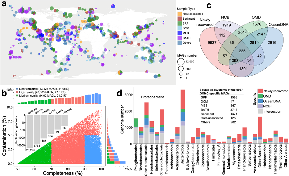 据介绍,这一数据库包含从南极到北极、从近海到深远海、从表层海洋到万米超深渊等海洋生态系统的信息,是已报道海洋基因组数据库Tara Ocean的3倍、蛋白序列库的60倍。其中,2万多个微生物是新发现物种,近1万个微生物为在深海独特生境中首次发现。