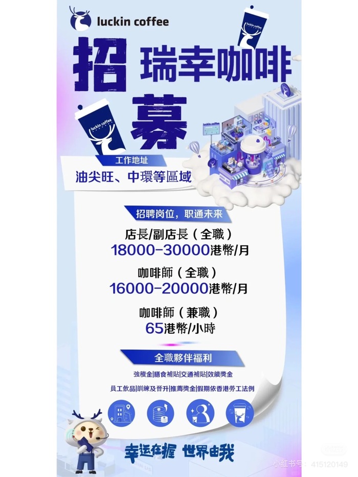 瑞幸或许很快就会开到香港。近日,小红书平台上流传一则瑞幸咖啡的招聘广告,当中列明工作地址为中国香港的油尖旺、中环等多个区域。此次公开招募的职位包括全职店长、全职副店长及全职或兼职咖啡师,月薪1.6万-3万港元不等,时薪则为65港元;福利方面,全职员工享有膳食及交通补贴、效积奖金、员工饮品、推荐奖金及强积金等福利。