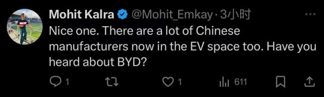 评论区里,网友Mohit Kalra说道,“牛啊,目前中国制造商大面积进军新能源汽车。”