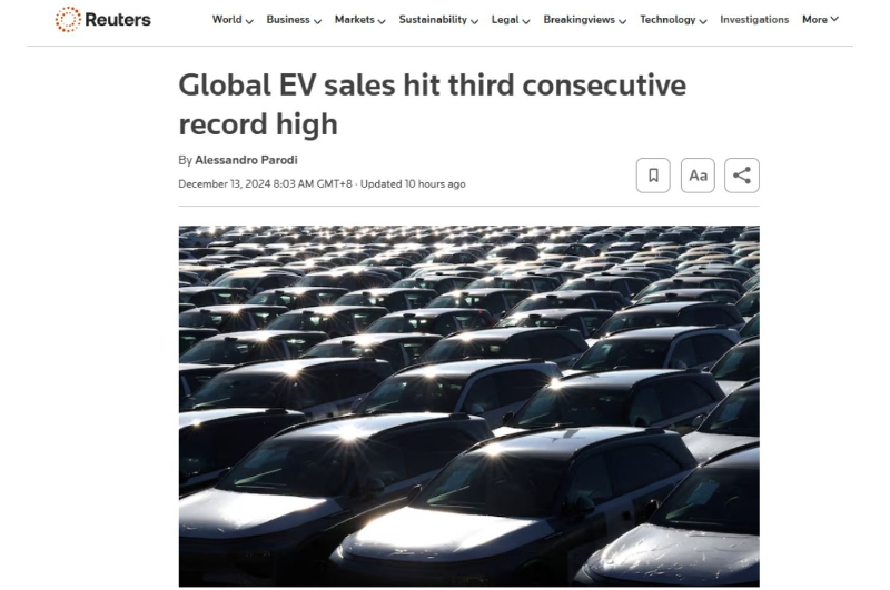 占全球总销量近70% 中国继续领跑全球电动汽车销售市
