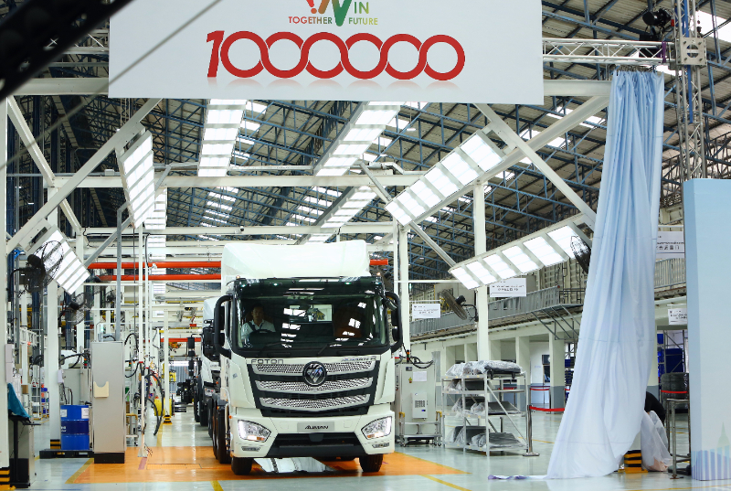 这是2024年11月27日在泰国北榄府的北汽福田泰国工厂拍摄的北汽福田商用汽车在海外销售第100万辆车下线仪式现场
