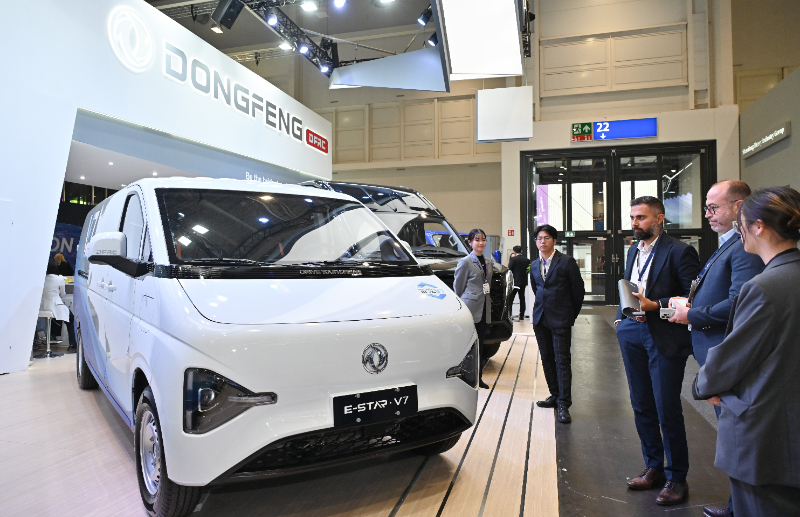 2024年9月16日,在德国汉诺威国际交通运输博览会媒体预展上,人们在东风汽车展区参观E-STAR V7商用车