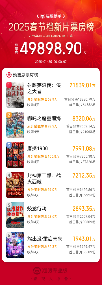 猫眼娱乐市场分析师赖力表示:“今年春节档被业界称为近几年综合实力最强的一届,待映的6部影片每一部都来头不小。《哪吒之魔童闹海》是2019年暑期档以及年度票房冠军《哪吒之魔童降世》的续作,前作票房累计超50亿元,位列中国影史票房榜的第四名,口碑票房双丰收。《封神第二部:战火西岐》是2023年暑期档电影《封神第一部:朝歌风云》的续作,前作在当年也收获了超过26亿元的票房,引发热烈讨论。《唐探1900》是“唐人街探案”这个IP再次定档春节的全新力作,前三部《唐人街探案》电影累计票房超过了87亿元,在下沉市场具备较高的热度。《射雕英雄传:侠之大者》是徐克导演的武侠新作,改编自金庸先生家喻户晓的同名小说,演员阵容强大,热度更是一路领跑。《蛟龙行动》是2018年春节档影片《红海行动》的续作,后者在当年春节档凭借强大的后劲最终成为春节档乃至年度冠军,总票房超36亿元。《熊出没·重启未来》实力同样不容小视,作为春节档的常驻系列,‘熊出没’系列大电影在过去多年已经累计超过了77亿元票房,2024年春节档,上一部《熊出没·逆转时空》的最终票房更是接近20亿元。因此,可见今年春节档的所有影片,基本都有强大的IP基础,受众群体广泛,市场潜力巨大。而从类型上看,今年春节档涉及喜剧、动画、动作、剧情、战争、武侠、神话、悬疑等多个类型,题材丰富,同样令人备受期待。有强大的IP打底,如若这批影片的口碑同样出众的话,我们也期待今年春节档的最终票房能够再创新高。”