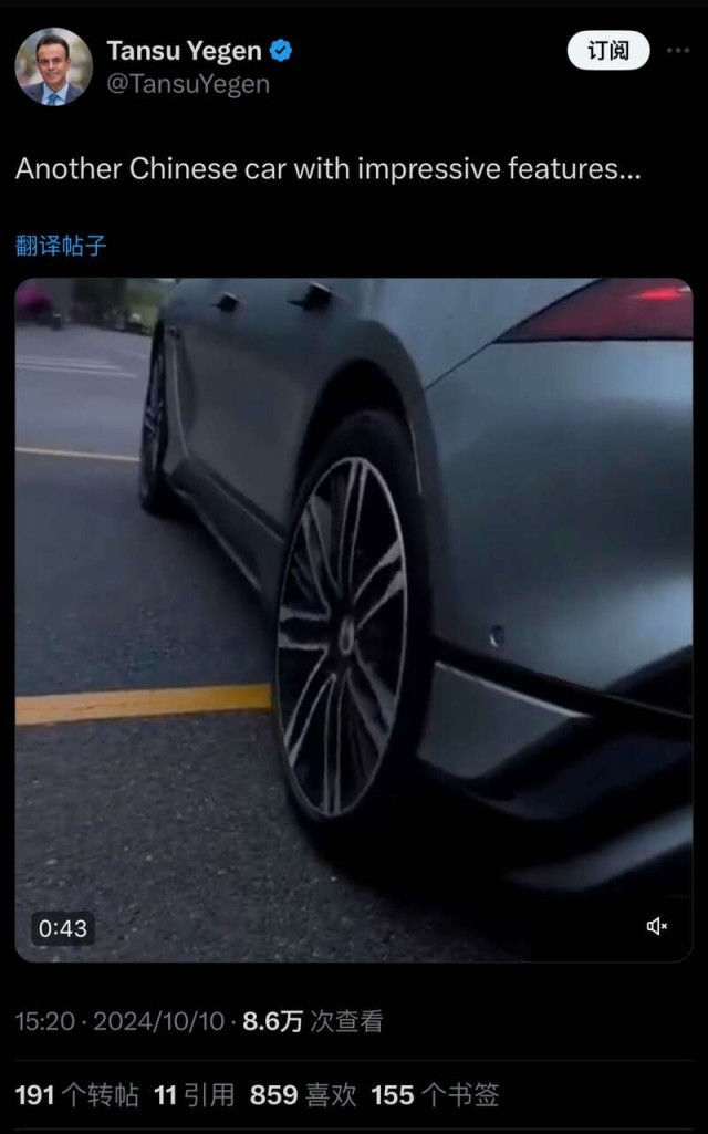 对于那辆会“自转”的车子,Tansu Yegen在推文中写道:“这是另一款让人印象深刻的中国汽车……”事实上,这辆车不仅能够实现后轮转向,更有一键调节底盘高度等多种功能。