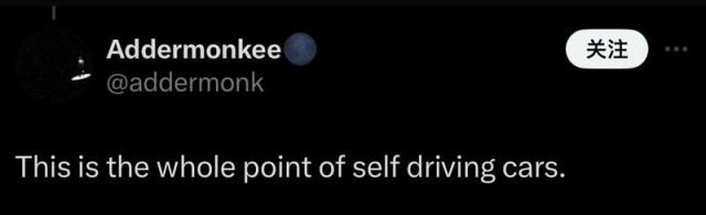 然而,网友Addermonkee显然很看好自动驾驶,他评论道:这就是自动驾驶汽车的全部意义所在。