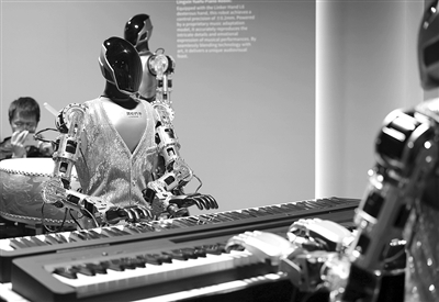 近日,在中关村论坛年会新闻中心内,人形机器人在演奏音乐